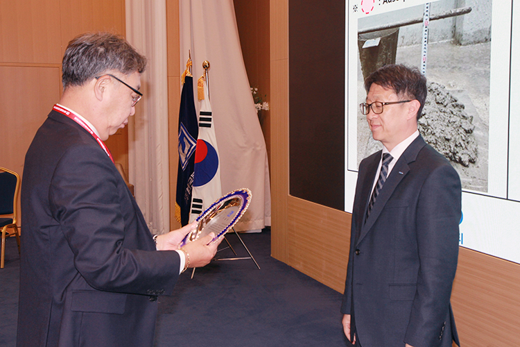 [사진] 김지상 한국콘크리트학회장()이 주영길 실크로드시앤티 기술연구소장()에게 기술상을 전달하고 있다.